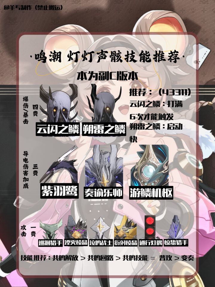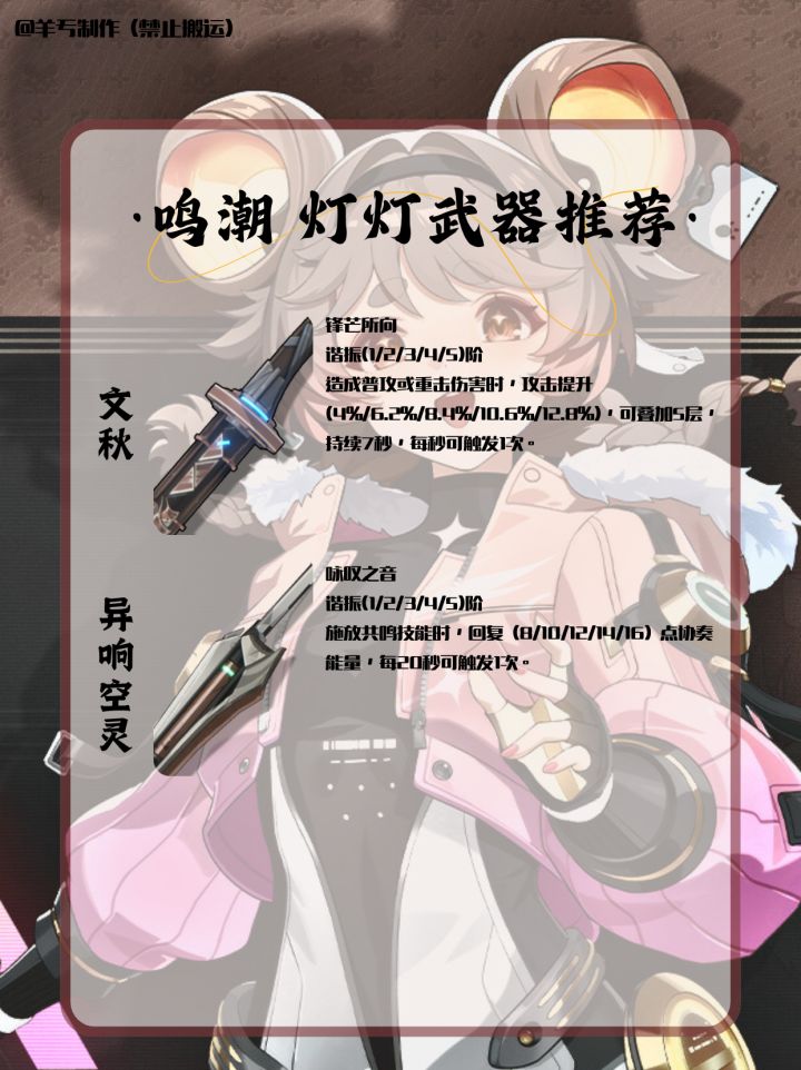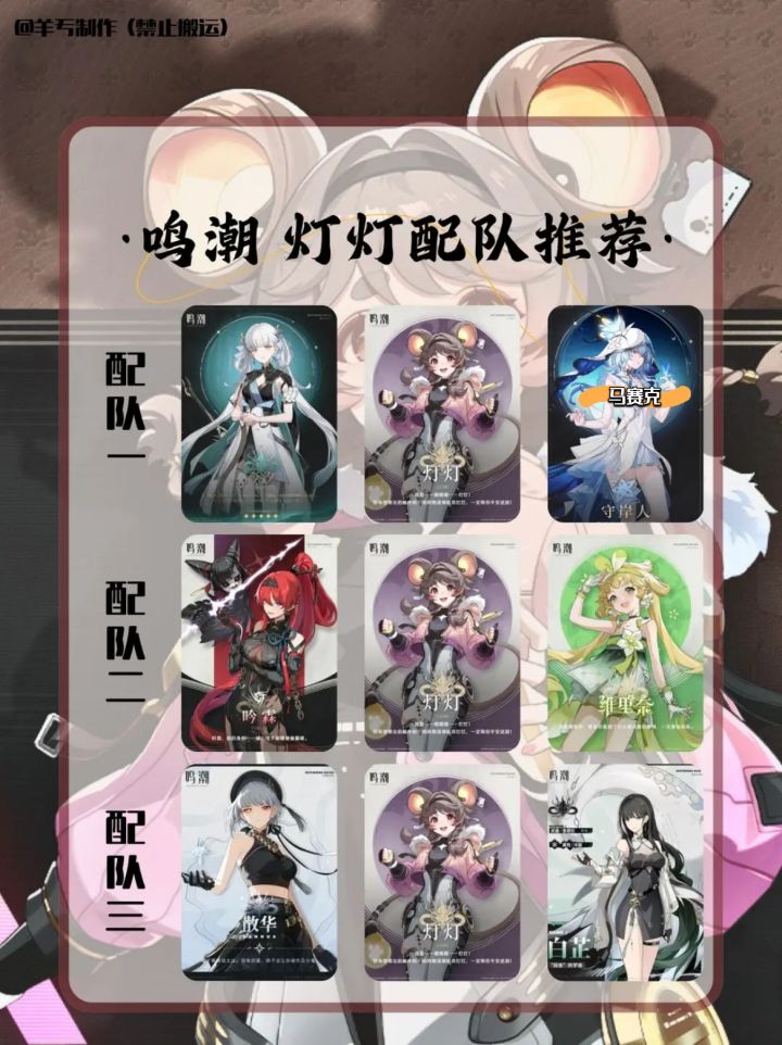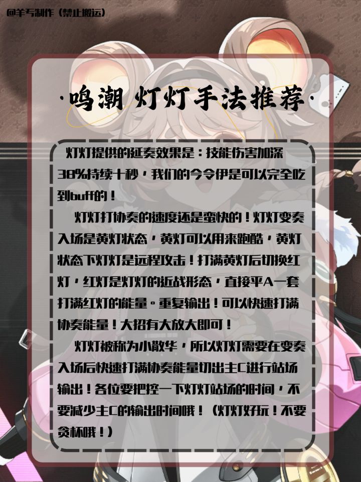各位指挥官,开拓者,旅行者,漂泊者,绳匠,组长,舰长,导演们,大家好啊。我是小编,羊亐。全新制作的一图流灯灯攻略~来了!希望各位能够喜欢!制作者:羊亐(不是洋芋)制作不易,禁止搬运。大家喜欢的话,可以关注小编!后续小编会通过一图流翻新角色攻略!#鸣潮 #鸣潮创作激励 #游戏攻略 #角色攻略 #鸣潮灯灯