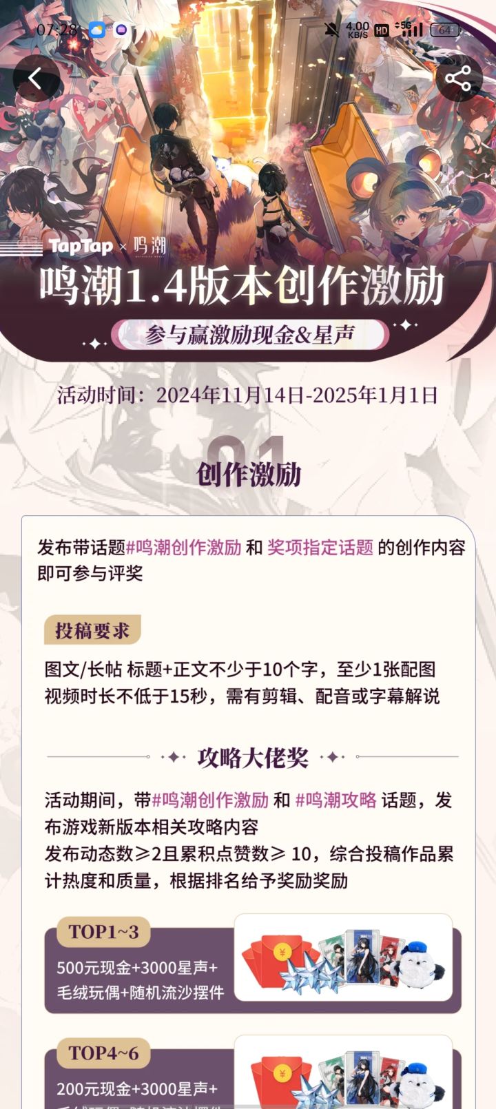 #鸣潮 #鸣潮暗夜叩响白昼之门 #鸣潮创作激励 《鸣潮》1.4版本「暗夜叩响白昼之门」创作激励活动现已开启。投稿《鸣潮》相关内容,有机会赢取创作现金、星声等好礼!点击前往活动页面>> 活动时间2024/11/14 11:00 - 2025/1/1 23:59参与方式带活动话题#鸣潮创作激励 以及 奖项指定话题,发布满足投稿要求的图文/长帖/视频即可参与。投稿要求图文/长帖投稿:至