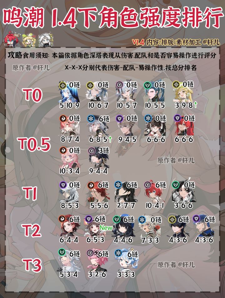 大家好,轩儿今天给大家带来鸣潮1.4下半全角色的强度评分,较上一期更新内容如下1、新增灯灯强度评分,灯灯本身定位主C或副C,可搭配散华、吟霖、长离等使用,配队中规中矩,新入坑玩家不建议培养,老玩家可根据喜好BOX来决定是否培养。优势在于大世界跑图非常方便,用来做大世界探索、配合长离刷怪很方便。操作手法方面机制相对没那么简单,需要频繁切换形态和关注协奏能量来打循环。总体评分6-5-3,定位T2。2