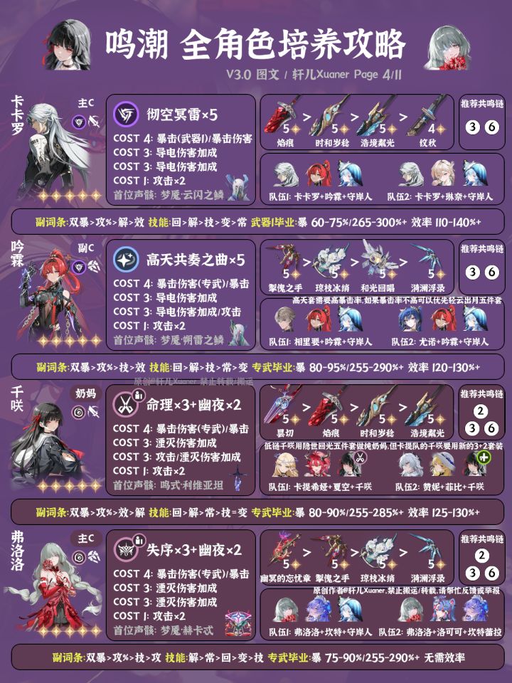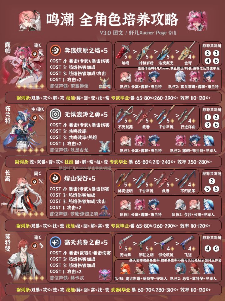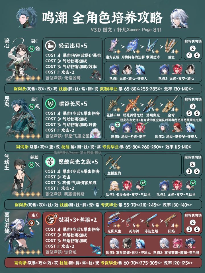 鸣潮最新3.0版本全角色培养一图流来了,截至琳奈共计44名角色。当前主要是给新入坑玩家使用,预计3.0晚些时候/3.1轩儿Xuaner会再更新一版把新的五把常驻武器计算进去,老漂们稍安勿躁~----------------------更新内容① 新增卜灵、琳奈。② 尤诺、相里要、卡卡罗等推荐配队做部分调整。----------------------攻略食用指南① 本篇内容大家可自己