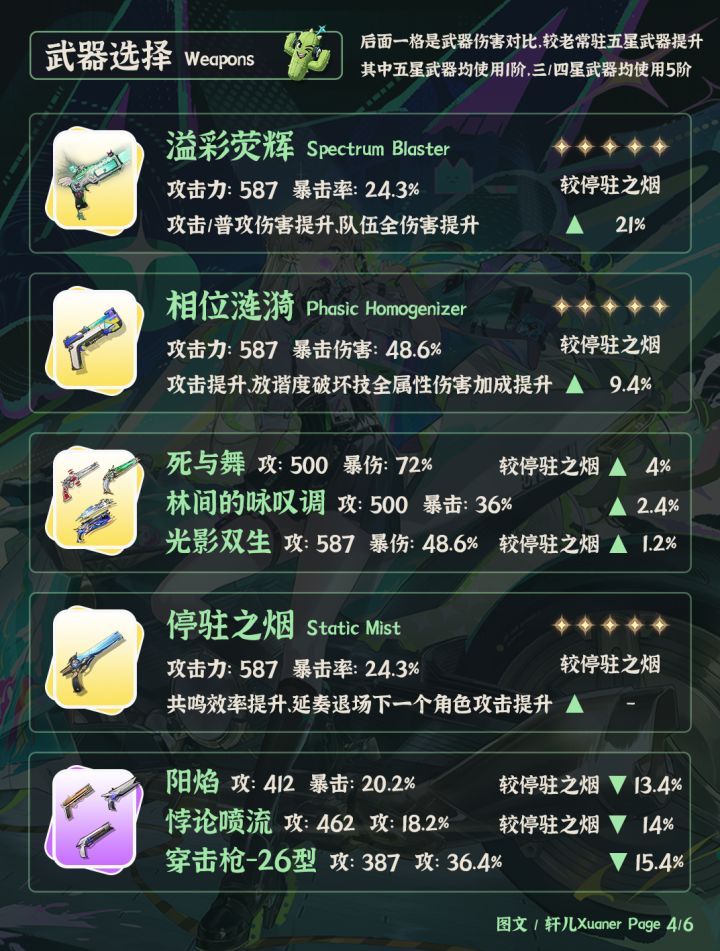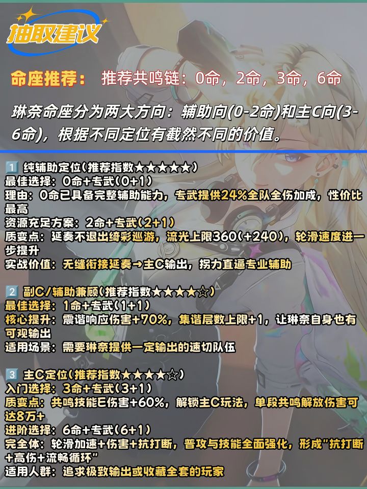 今天给大家带来琳奈的保姆级一图流攻略2-5页主要是“抽取建议”“声骸搭配”“武器选择”“技能加点”6-9页主要是“配队推荐”队伍种类多样,选择性多。————————————————————①琳奈命座分为两大方向:辅助向(0-2命)和主C向(3-6命),根据不同定位有截然不同的价值。辅助定位:0命+专武(0+1):性价比之王,已具备完整辅助能力2命+专武(2+1):质变点,延奏不退出