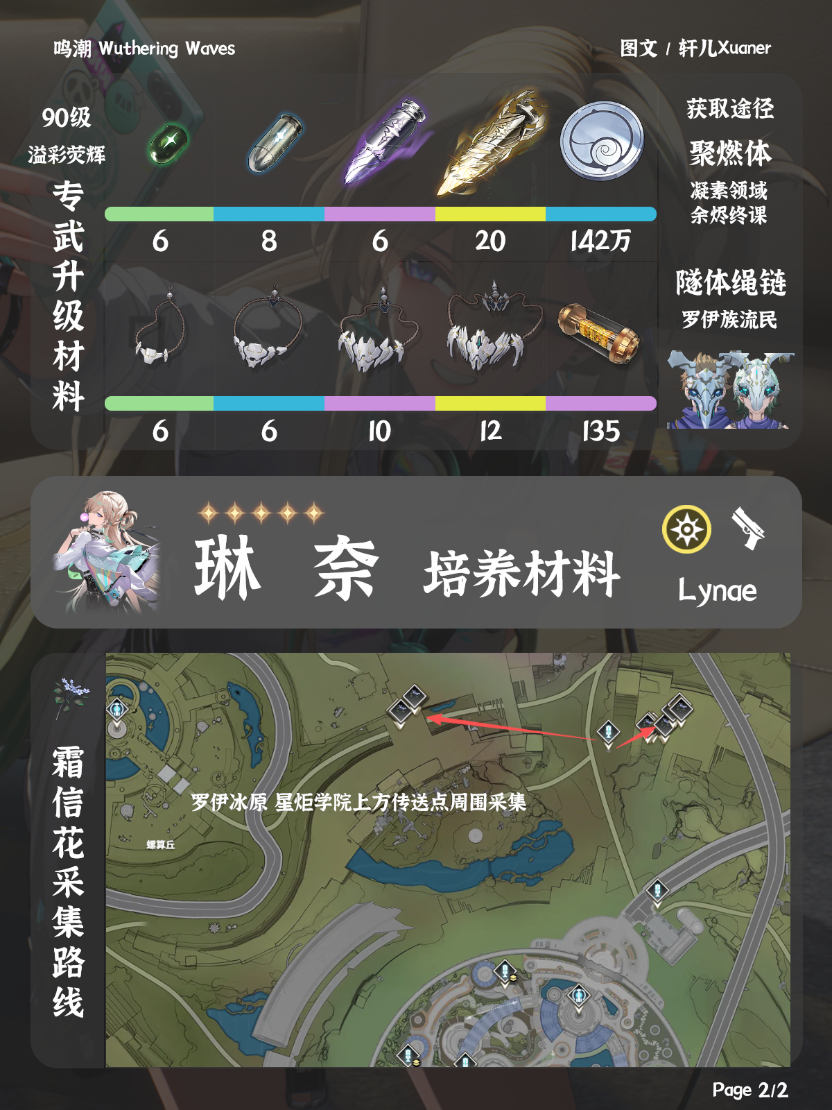 Hello,这里是漂泊者小助手轩儿Xuaner~本期攻略内容是琳奈培养材料,由于素材原因放到开服后发啦,包括琳奈突破升级材料、技能升级材料、专武突破升级材料、霜信花采集位置。--------------------------① 聚燃体系列:凝素领域·余烬终课(浮光林右下方)② 隧花声核系列:隧群掉落③ 隧体绳链系列:罗伊族流民掉落(罗伊冰原的人形怪)④ 技能材料无妄之羽:周本BOSS