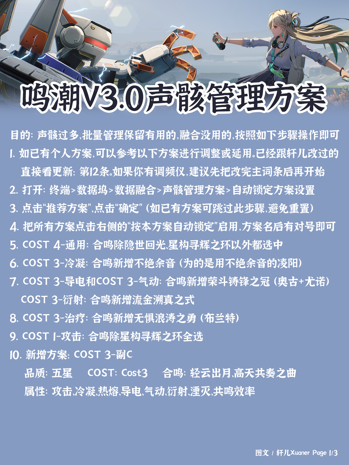 鸣潮3.0版本新上线三个声骸套装,我们对声骸管理方案进行一下更新。具体步骤可以参考图文内容。有以下几点需要注意:① 如果你已经有自己的方案,可以参考做调整或延用自己的。② 如果你有调频仪,且正在着重培养某一套声骸,可以先用调频仪把主词条改对,或者先培养完之后再进行整理,避免被融合。③ 某些针对系统推荐方案的调整其实是针对特定角色声骸使用的,如果你不需要培养该角色,也可以根据自身需求进行修改。