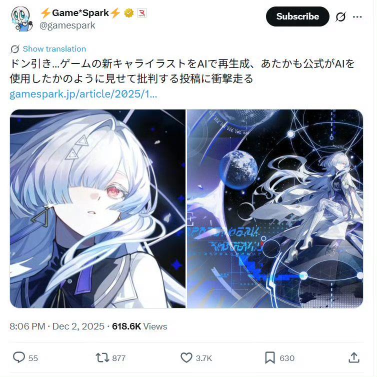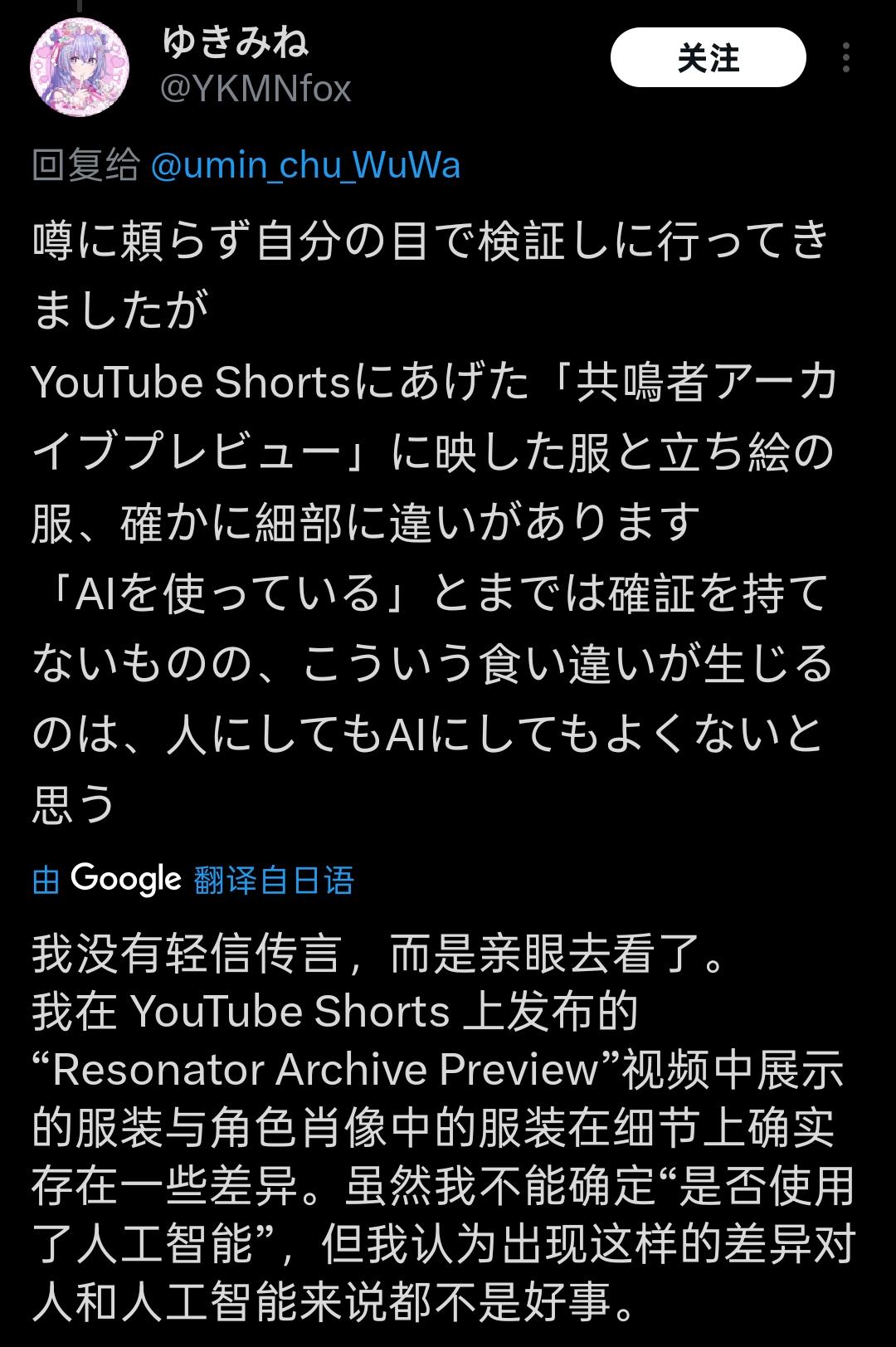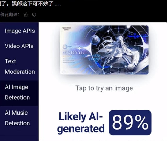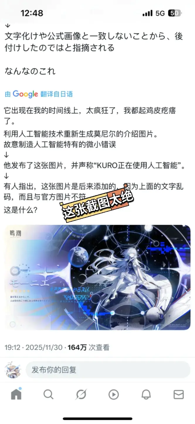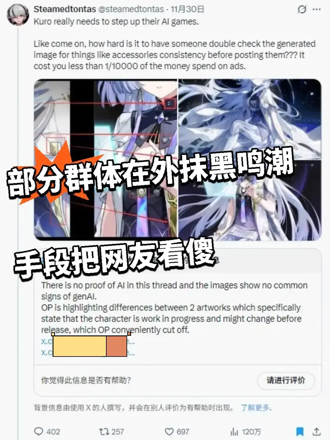 单纯论AI鉴图这事,倒是明了,无非就是有人把莫宁的官方图用AI跑一遍,然后再去鉴AI,最后得出结论官方图用了AI。发布谣言的账号我看了下是美国属地和美国APP(X最近新推出的功能,不过也有人指出这实际上是B站某个同名华人用户的账号,也是美国IP),X上反攻的主要是日本玩家,不过和之前的那些节奏一样,都是X删除争议贴但不封账号。然后这事传回国内,在贴吧、B站等平台又进行了二次发酵。不过我看了下