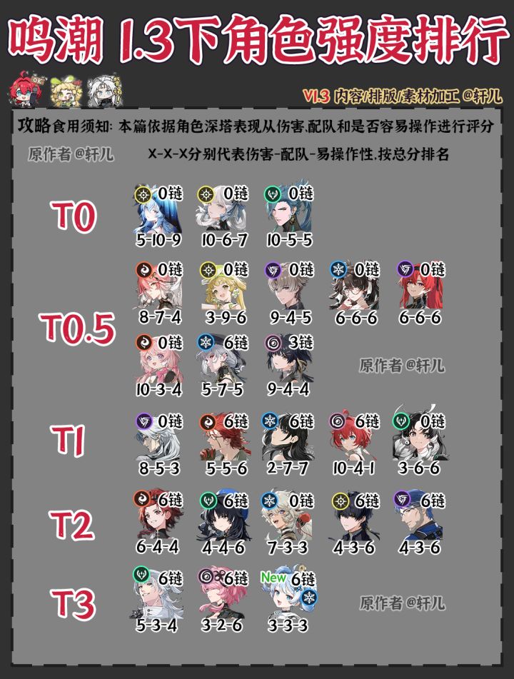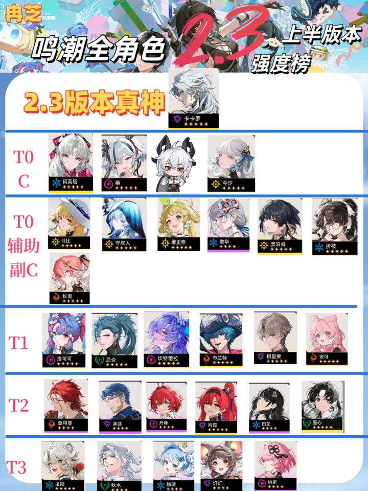 大家好,我是轩儿Xuaner,鸣潮V2.2上半最新全角色排行榜出炉~本次更新内容:1、由于没有新角色加入,本期排行榜较上期变化不大2、关于上期出来很多人讨论椿和菲比的位置是不是反了,这里说一下本份榜单使用0链角色,武器使用除了专武以外最适合的武器。如果椿是2-3链有专武,那肯定是T0。在0链基础对比上,菲比打老深塔BOSS表现会好一些。椿在新塔冥歌海墟绝对对群T0。所以再次强调下根据个人角色