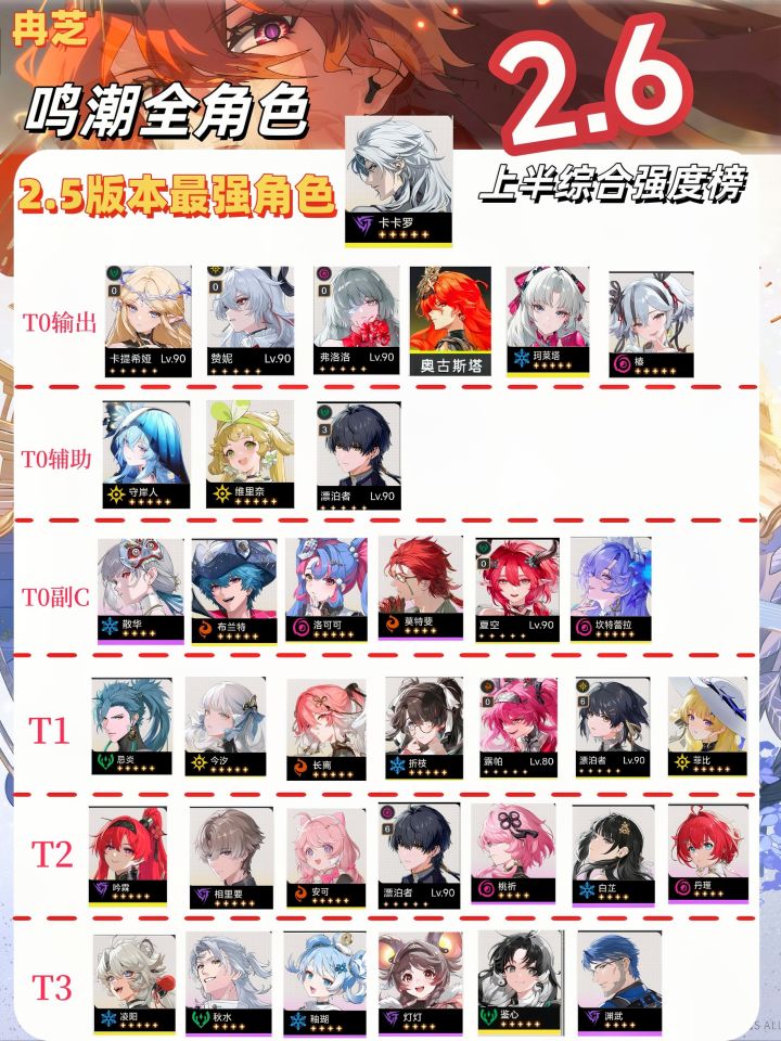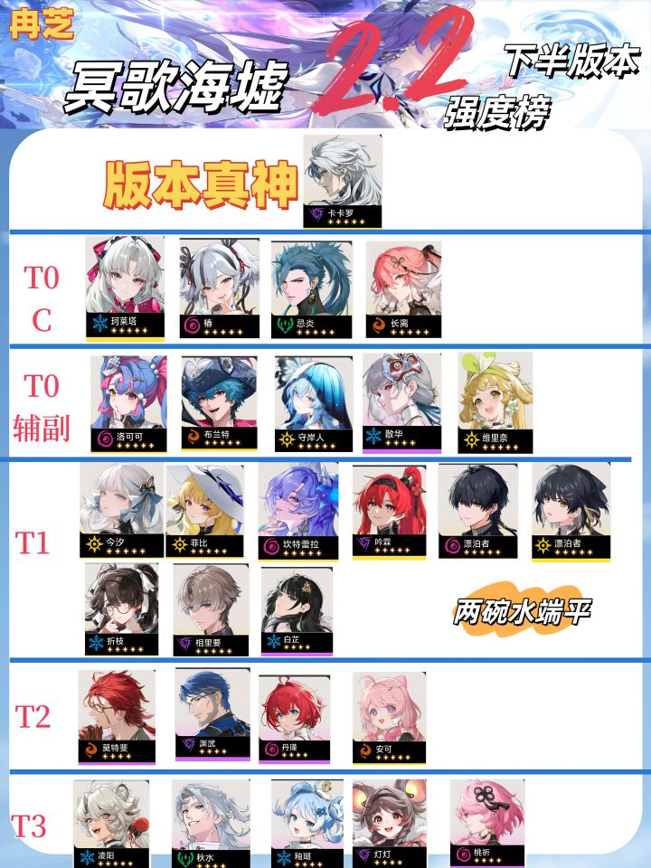 大家好,冉芝带着鸣潮2.2下半版本深塔强度榜来啦,给大家分为深塔和冥歌海墟两个榜方便大家查看。✅️版本真神卡卡罗大人,手法好的大佬我相信他是能打出来的 🌠本排名从三方面入手:通用程度,抽取价值,配队思路三方面去评,级别由T0,T0副C/辅,T1,T2,T3构成。 ·T0C:养成收益极高,投入回报高,配队完整强度在线。·T0辅助/副C角色:强度在线且收益高就业广阔角色。深塔配队常用·T