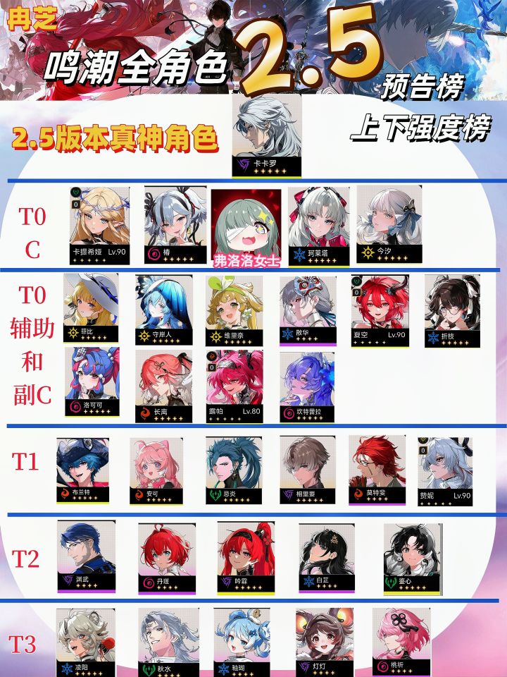 2.5更新内容:5星共鸣者「弗洛洛」(湮灭 | 音感仪)上半复刻【洛可可】下半【坎特蕾拉和布兰特】✅️弗洛洛的加入,对排行榜还是有不小影响的。弗洛洛v3加强了轮切,所以T0位置2.5版本肯定是稳坐的。等版本更新坎特蕾拉如果很适配弗洛洛的话强度还是会更上层的。✅️下半复刻坎特蕾拉和布兰特 ,如果2.4已抽露帕的玩家必拿布兰特(0+1起步);无露帕可跳过。露帕专属副C,提供热熔队增益与后台输