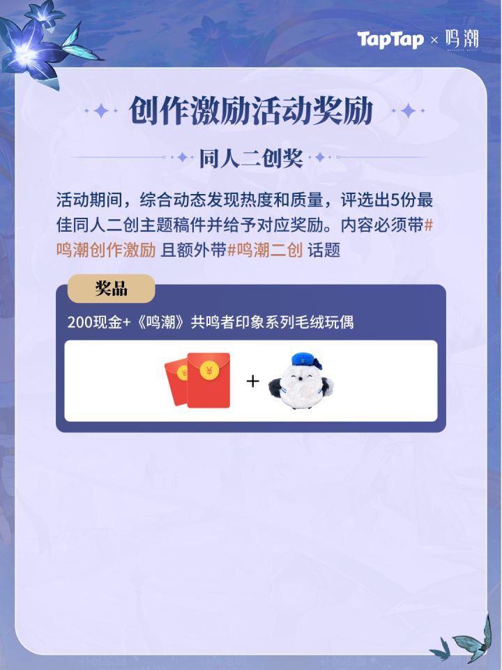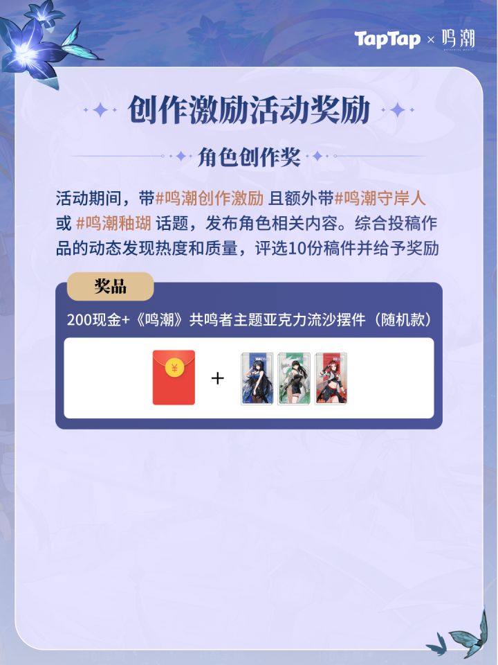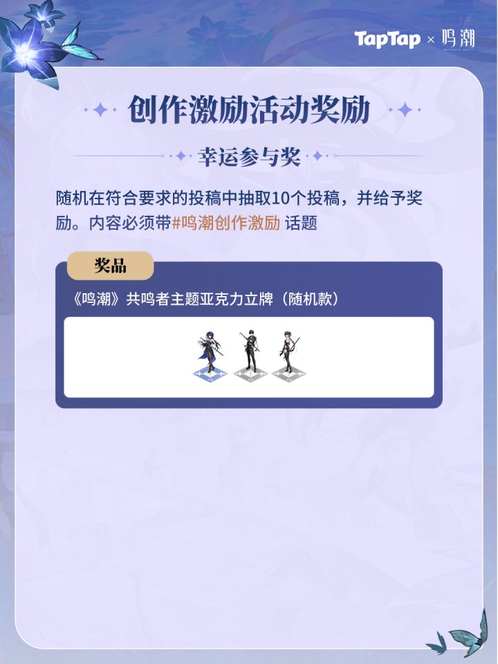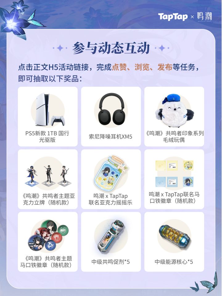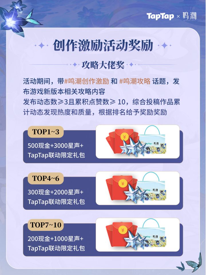 《鸣潮》1.3版本创作激励活动现已开启!参与即有机会赢取创作现金和星声!活动时间:09/29 11:00-11/13 23:59🎁抽奖活动看「鸣潮」动态,即可抽取PS5、索尼耳机、游戏道具等奖品~详情点击:https://www.taptap.cn/poster/NEFdHyCiwe2m 或点击文末banner进入活动页 🎁激励活动【攻略大佬奖】活动期间,带#鸣潮创作激励 和 #鸣潮