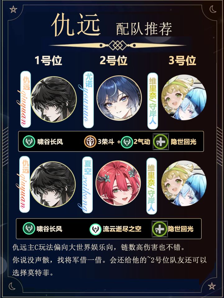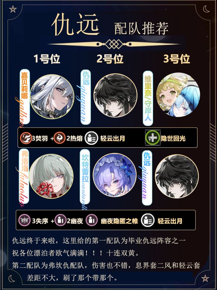 仇远终于来啦,祝各位漂泊者欧气满满!!!十连双黄。 这里给的第一配队为毕业仇远阵容之一 第二配队为弗坎仇配队,伤害也不错,息界套二风和轻云套 差距不大,刷了那个带那个。 仇远主C玩法偏向大世界娱乐向,链数高伤害也不错。 你说没声骸,找将军借一借。会还给他的~2号位队友还可以 选择莫特菲。仇远主C要打重击输出! #鸣潮创作激励 #鸣潮攻略 #鸣潮 #鸣潮嘉贝莉娜 #鸣潮仇远 #鸣潮剧情 #踏上鸣日的
