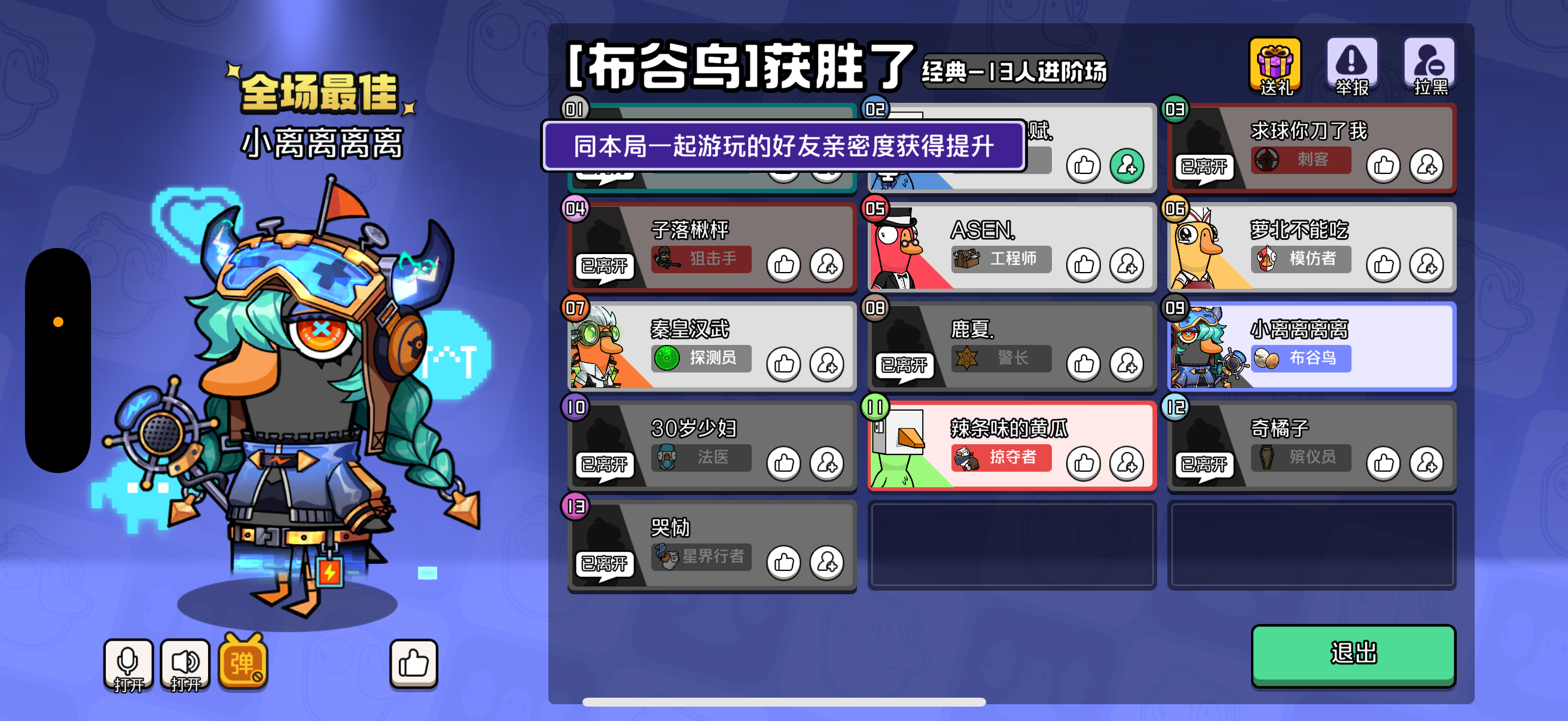 大家可以输入兑换码和我进行组队,来获得限定称号和动作,你和我一起进行对局会获得额外经验 如果我们积极升级到15级的话会解锁全部限定皮肤 队伍码: T4RCRNC #鹅鸭杀 #鹅鸭杀手 #鹅鸭杀公测 #鹅鸭杀手游定档