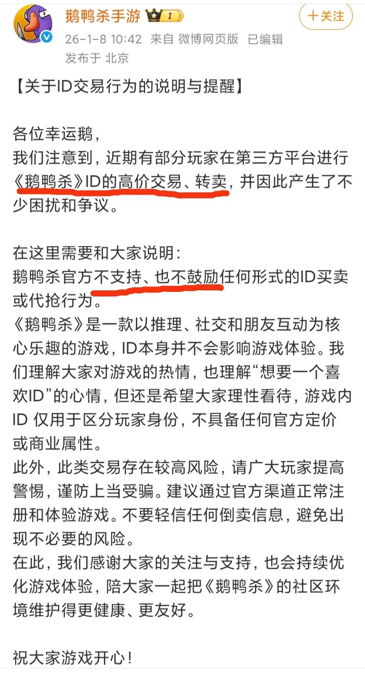 各位幸运鹅,我们注意到,近期有部分玩家在第三方平台进行《鹅鸭杀》ID的高价交易、转卖,并因此产生了不少困扰和争议。在这里需要和大家说明:鹅鸭杀官方不支持、也不鼓励任何形式的ID买卖或代抢行为。《鹅鸭杀》是一款以推理、社交和朋友互动为核心乐趣的游戏,ID本身并不会影响游戏体验。我们理解大家对游戏的热情,也理解“想要一个喜欢ID”的心情,但还是希望大家理性看待,游戏内 ID 仅用于区分玩家身份