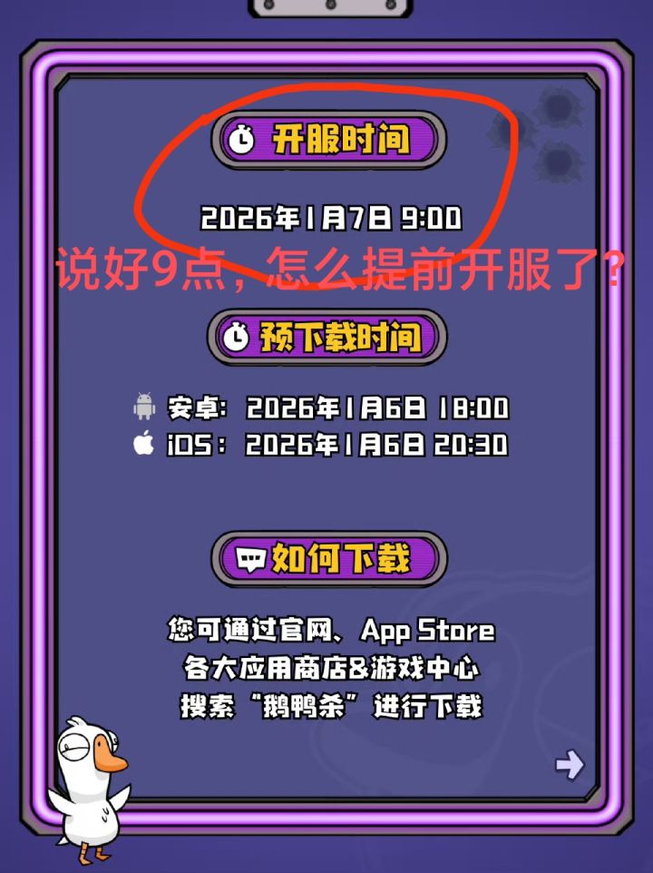 1月7号上午9点,《鹅鸭杀》手游正式公测上线🔥🔥🔥游戏开服宣传语打出了“真心换真心”的口号,但是却有玩家发现游戏提前开服了!有的人8:40就进入游戏了。这让那些“守规矩”、定闹钟的老实玩家心里很不舒服,说好的9点开服呢。就有玩家因为“按时”进游戏而导致心仪的游戏昵称被抢注……毕竟游戏全网预约人数高达2000万,即便是只有十分之一人按时上线注册,那也有200万人。或许这可能也是官