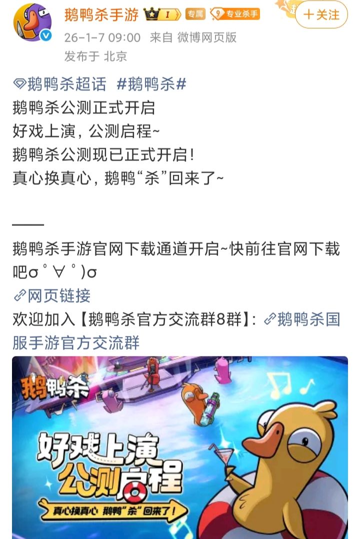 好戏上演,公测启程~鹅鸭杀公测现已正式开启真心换真心,鹅鸭“杀”回来了~请幸运鹅们前往TapTap详情页下载游戏:各位幸运鹅准备好开启新的「整活」之旅了吗?点击链接加入群聊【鹅鸭杀官方交流群 9 群】:#鹅鸭杀 #鹅鸭杀手游 #鹅鸭杀手游正式上线 #发现好游戏