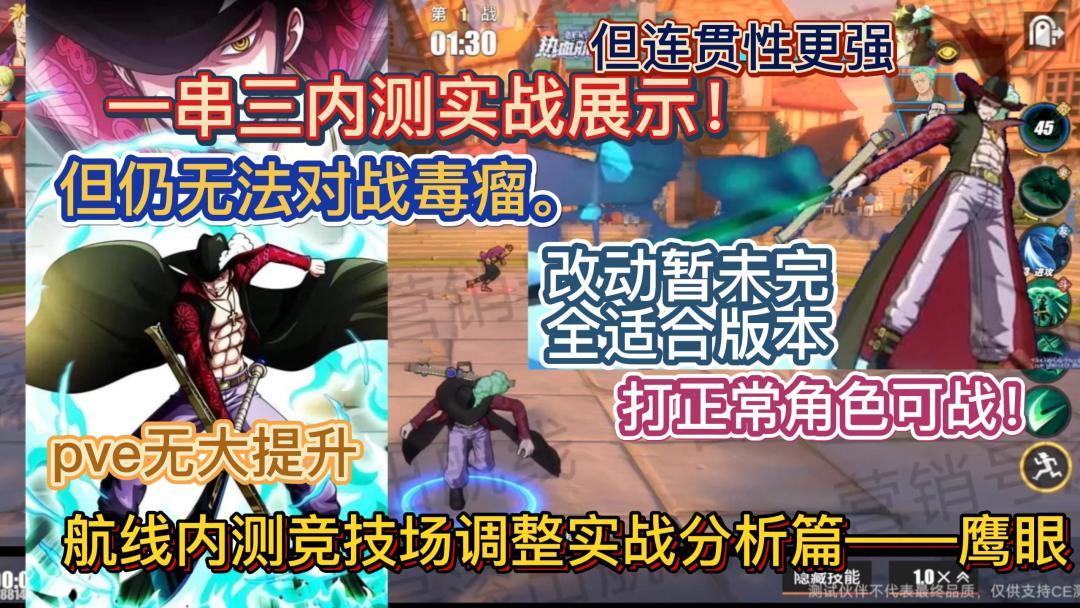 航线内测竞技场调整实战分析篇——鹰眼,一串三内测实战展示!打正常角色可战!但仍无法对战毒瘤。改动暂未完全适合版本,但连贯性更强,pve无大提升【航海王热血航线】