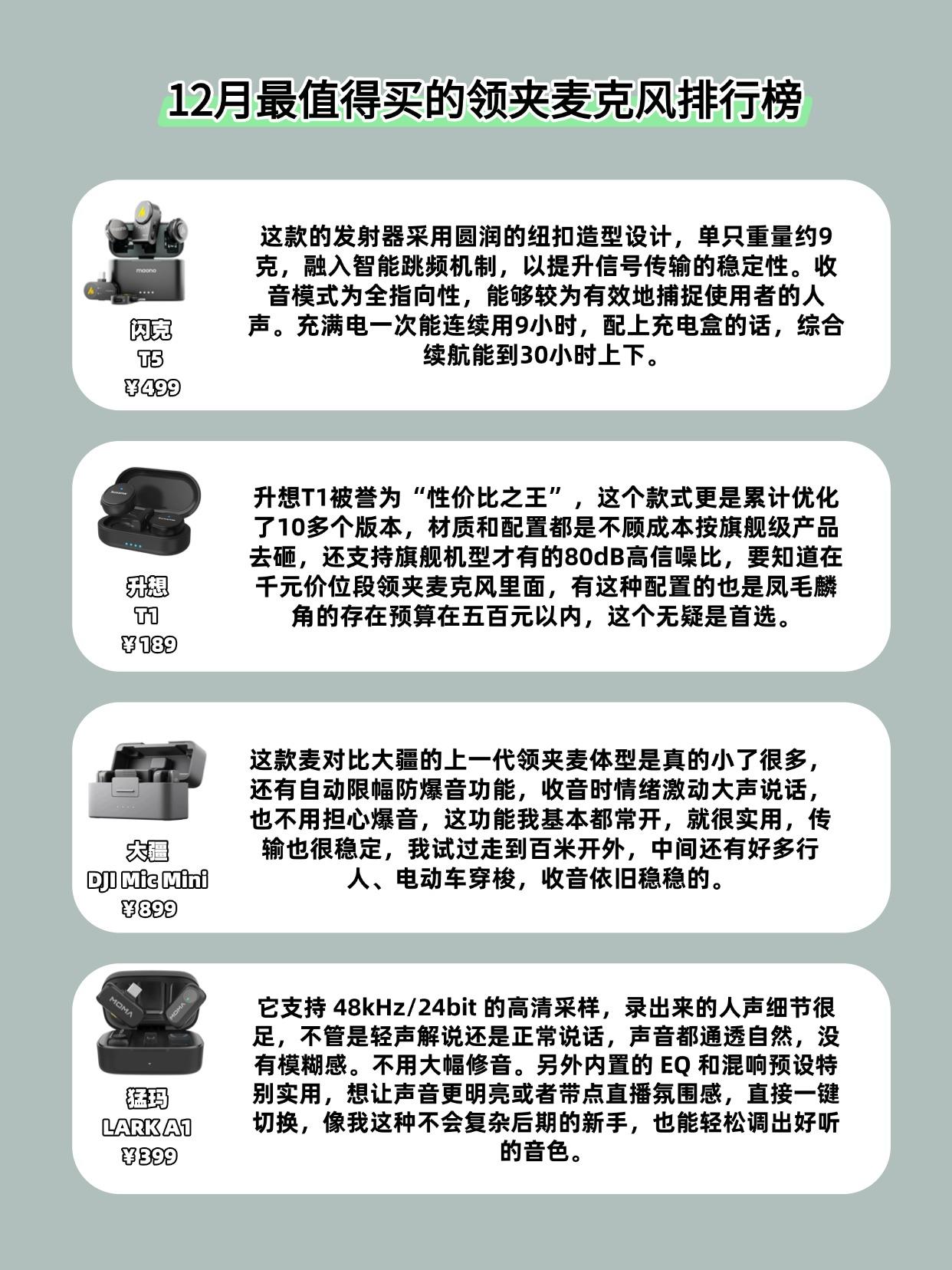 想入手领夹麦克风的朋友看这篇!整理了 12 月最值得买的领夹麦榜单,从百元到千元档都有,按需求闭眼挑不踩坑👇 🌟 百元档首选:升想 T1(¥189) 评分 9.1直接封神的性价比之王!累计优化 10 + 版本,硬是把旗舰级 80dB 高信噪比塞进了百元机里 —— 要知道这配置在千元麦里都算稀有款。全指向收音清晰,降噪能力直接拉满,500 元内预算闭眼入,学生党、新手试水必冲。 🚀 专业级标杆:大