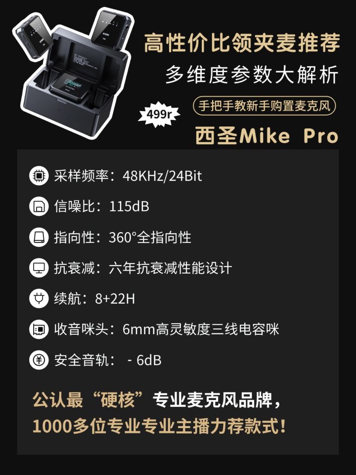 #新手小宝挑无线领夹麦克风的痛我懂😭!前前后后买了好几次,不是收音差,声音模糊不清,就是降噪不行,录完的音频杂音一堆,剪辑起来很麻烦。好在皇天不负有心人,终于让我挖到这款西圣Mike2无线领夹麦克风👏。 它采用第2代ALPT高密度拾音技术,搭配48kHz采样率和24Bit高采样技术,能捕捉到超多声音细节,声音清晰又饱满。还有70dB的高信噪比和110dB SPL高声压级,不管在什么环境下,都能稳