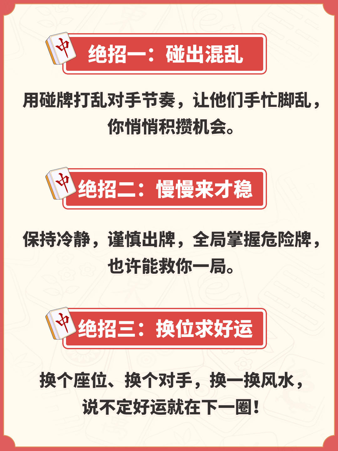 无论你是牌场老手,还是刚入坑的小白,总有几局——牌运像跟你作对。别慌!这份“翻盘秘笈”教你让逆风也能变顺风!🀄 绝招一:碰出混乱用碰牌打乱对手节奏,让他们手忙脚乱,你悄悄积攒机会。🀄 绝招二:慢慢来才稳保持冷静,谨慎出牌,全局掌握危险牌,也许能救你一局。🀄 绝招三:换位求好运换个座位、换个对手,换一换风水,说不定好运就在下一圈!各位雀神们,逆风局的时候你们都靠什么翻盘?欢迎分享你们的