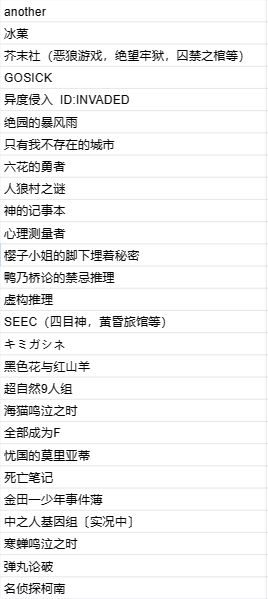 有人感兴趣吗#another冰菓芥末社(恶狼游戏,绝望牢狱,囚禁之棺等)GOSICK异度侵入 ID:INVADED绝园的暴风雨只有我不存在的城市六花的勇者人狼村之谜神的记事本心理测量者樱子小姐的脚下埋着秘密鸭乃桥论的禁忌推理虚构推理SEEC(四目神,黄昏旅馆等)キミガシネ黑色花与红山羊超自然9人组海猫鸣泣之时全部成为F忧国的莫里亚蒂死亡笔记金田一少年事