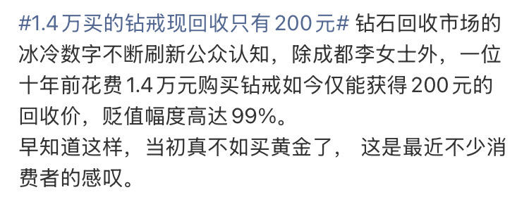 虽然早就听说过钻石是不保值的,但也没想到差这么多,之前还以为起码能值个几千呢,这和黄金是完全没法比了,如果是黄金的话应该还能涨不少了,但钻石的话就算保本也差了好多,如果想保值还是选黄金吧。 #生活杂谈 #热点事件 #黄金