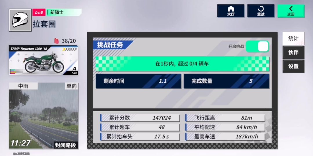 根据大神提供的思路,除了逆行和无救援次数,其他全选 车是满改S车拿铁,蓝色量产型芯片,操控和制动力+3 开局不知死活氮气赶路,直接被变道车辆教做人,之后就保持不低于最低速度龟速行驶,加上那么一点运气,剩余两次救援机会惊险通过,美美拿下20张补给券[表情_酷] #黎明飞驰公测 #黎明飞驰创作激励 #黎明飞驰promotor #黎明飞驰玩家大赏 #黎明飞驰创作 #黎明飞驰motogp #黎明飞驰玩家#黎明飞驰一周小活动