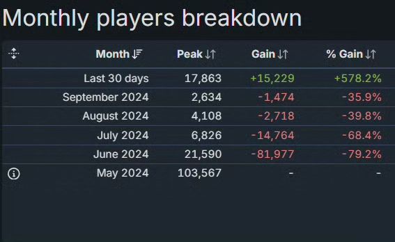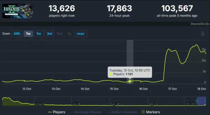 10/17号,根据STEAM平台上显示,在《黑帝斯2》玩家数量较上个月暴增578.2%❗❗❗据悉,游戏刚刚经历了一次大型更新,添加了新地图、角色、武器等,并进行了大量的改进和优化《黑帝斯2》在Steam平台的24小时在线峰值为17863人,相较上个月才2634人的玩家峰值,本月增加了15229名玩家,涨幅度达到578.2%