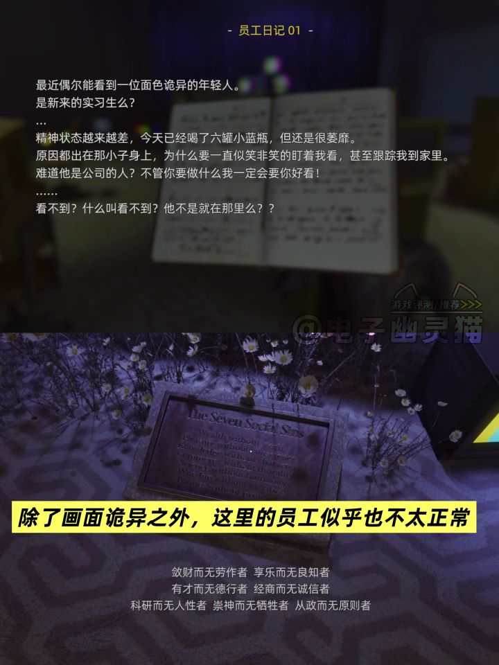 “假日休息时间将被调整为上班时间,并不得作为加班进行记录”,就问你恐不恐怖吧,真的吓死个人!游戏时长9.4(包含大概一个小时挂机时间),剪辑后我的全流程大概5小时(可以去B站看)。 如果你喜欢层层恐惧、艾迪芬奇的记忆这类步行模拟+叙事手法的,那你应该会是这个游戏的受众。千万不要看着打“恐怖游戏”tag就想着会和逃生、生7这类一样,完全不一样的!因与果和那些生存恐怖,或者涉及资源管理的恐怖,压根就