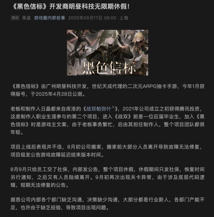 #今天游戏圈发生了啥 #资讯评论员 #游戏资讯 #黑色信标 #黑色信标疑似要凉 30📅由广州明昼科技开发、上线不足半年的现知名二次元手游《黑色信标》,项目被曝采取 “无限期休假” 措施,相关信息引发网友激烈讨论,关联话题登上热搜(话题热度接近百万,讨论度接近半百万)📉游戏目前虽然还未正式宣布停止服务,但目前未见有关游戏新版本内容的关联信息(有信息可以提醒一下)目前官方团队尚未对该热点话题