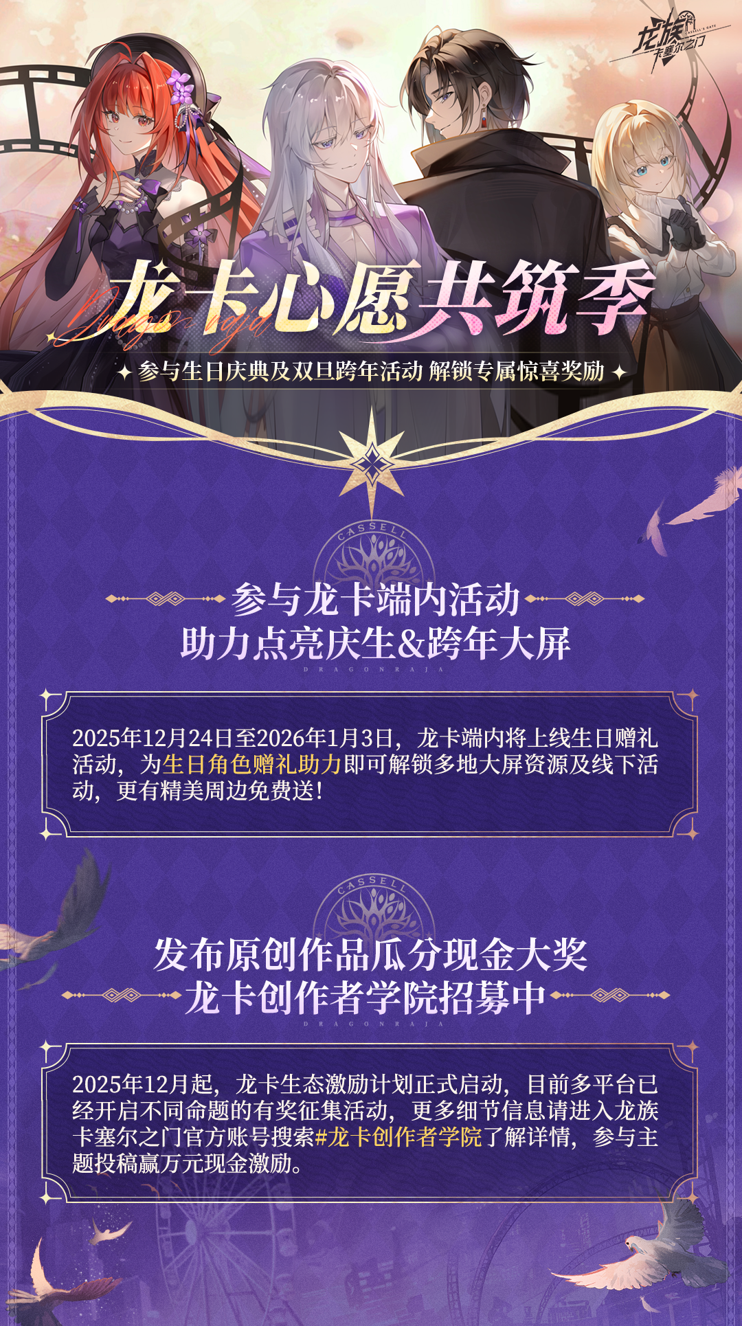 亲爱的专员,全新限时活动「心愿共筑」即将于12月24日正式开启!四位伙伴生日在即!专员们准备好为绘梨衣、源稚生、源稚女和零共庆生日了吗?更多活动预告详见下图。#龙族心愿共筑季 #龙卡创作者学院 #龙族 #龙族卡塞尔之门