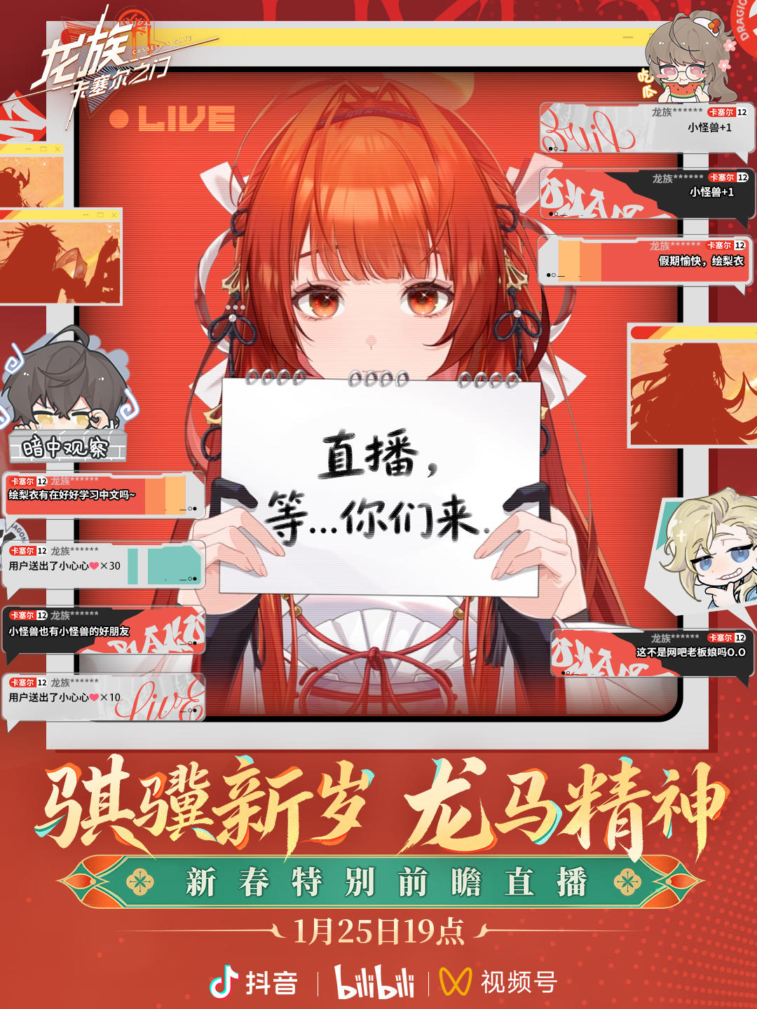 亲爱的专员,《龙族:卡塞尔之门》新春特别前瞻直播「骐骥新岁 龙马精神」直播录像已送达! 全新新春系列活动即将于1月28日上线! 感谢专员们的关注与支持,更多新春版本内容详情,敬请关注官方后续公告。 #龙族多元平行宇宙 #卡塞尔学院寒假倒计时 #龙族 #龙族卡塞尔之门