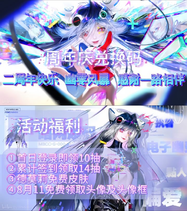 周年庆活动时间:7月25日-8月15日🌟兑换码二周年快乐幽零风暴感谢一路相伴🌟活动福利①首日登录即领10抽②累计签到领取14抽③德莫莉免费皮肤④8月11免费领取头像及头像框🌟新增禁闭者限定诡秘特化:000狂级坚韧特化:摩尔危级狂暴特化:瑞思🌟新增皮肤局长:假日闲情000:异度魔女科希:繁星幻币#无期迷途 #000 #周年庆 #宝藏游戏安利派对 #浅评一下