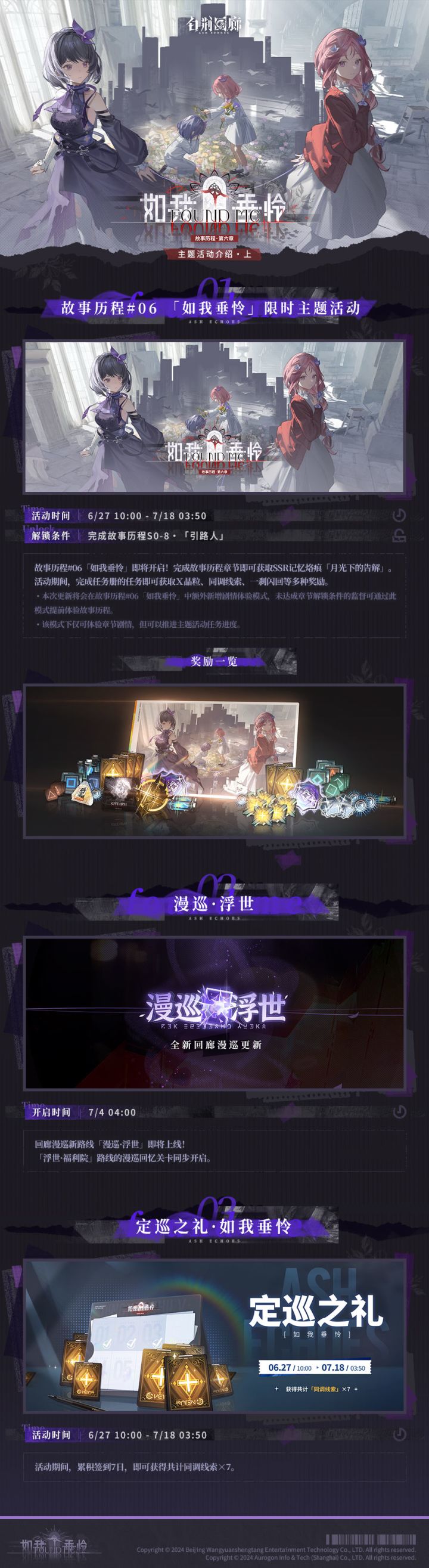 「故事历程·第六章」已于6/27 10:00 开放!完成故事历程章节即可获取SSR记忆烙痕。在故事历程限时活动期间,完成任务册内的任务即可获取X晶粒、同调线索、一刹闪回等多种奖励。同时,故事历程#06 「如我垂怜」中已额外新增了剧情体验模式,未达成章节解锁条件的监督可通过此模式提前体验故事历程。※在该模式下,监督可以体验章节剧情,同样会计入主题活动进度。▶活动入口主界面 - 「如我垂怜」▶
