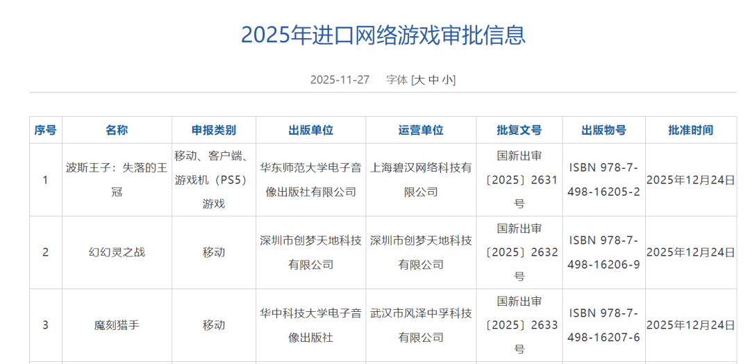 2025年12月25日,国家新闻出版署公布了《2025年12月份国产网络游戏审批信息》,其中144款游戏过审,部分信息详见下图!