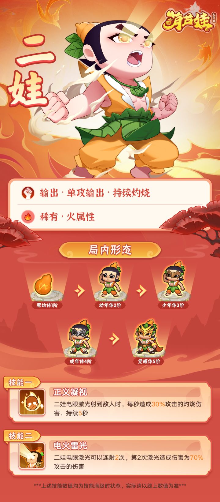 「细语飞鸽承传递, 嘹亮疾风谨记名。」无论如何细小的声音,如何遥远隐秘的故事,都逃不过二娃的感知。他不仅洞开双窍,还有玲珑通透的智慧心。在妖魔的无尽诱惑、幻象、诡计背后,二娃永远能料敌先机,算无遗策。《葫芦娃大作战》中的二娃则是定位输出的单体灼烧英雄,他逼出敌人心中恐惧,以雷电火焰之力降下惩戒,真是名副其实的正义又聪慧~#1206葫芦娃大作战#葫芦娃大作战