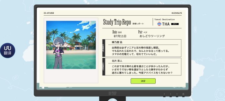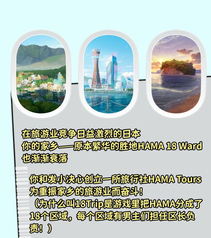 🎮游戏名:18 Trip🎮平台:IOS/安卓目前外服已上线!游戏背景发生在贴近现实的平行世界,在旅游业竞争激烈的霓虹中,有人气的景区会作为“独立观光特区”活跃。主人公的家乡HAMA18区(原型就是横滨现在已经没落,主人公在已经成为一家旅行社社长的发小“大黑可不可”邀请下,也成为了公司的一位主任,为了重振家乡旅游业,和其他另外身为区长的社员一起奋斗!游戏的设定非常有意思,之所以叫做《18 T