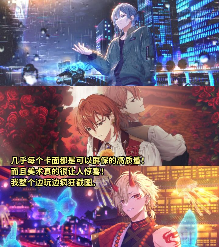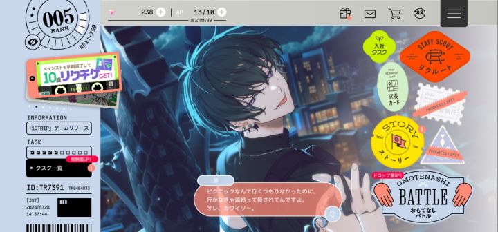 之前安利的18trip上线两天啦,玩了两天之后我的感想就是:求求你快出国服吧,我真的很想玩中文版的!首先游戏画面超级好看,人物每一个都很好看,UI设计很美还很贴合主题,过场的播片也做得很好,音乐是青春阳光那一卦的,看得出经费很充足,玩得我尸体暖暖的开心游戏的剧情全程配音,而且大部分都很贴脸,女主的声音更是活泼开朗,超级可爱!主线还真的就在认真搞事业!大家聚集起来开公司招人