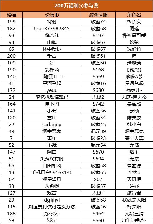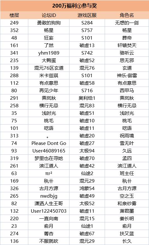 12月全活动导航,精彩活动不错过:========================【200w福利第二弹开奖】一、200万分享奖3名,奖品为:“仙途保温杯”1个、仙途精美口罩100个、388仙玉、寻宝令*20、灵兽口粮*200中奖玩家:二、200万故事奖3名,奖品为:288仙玉、寻宝令*10、灵兽口粮*100中奖玩家:三、200万参与奖30名,奖品为:128仙玉、寻宝令*8、灵兽口粮*