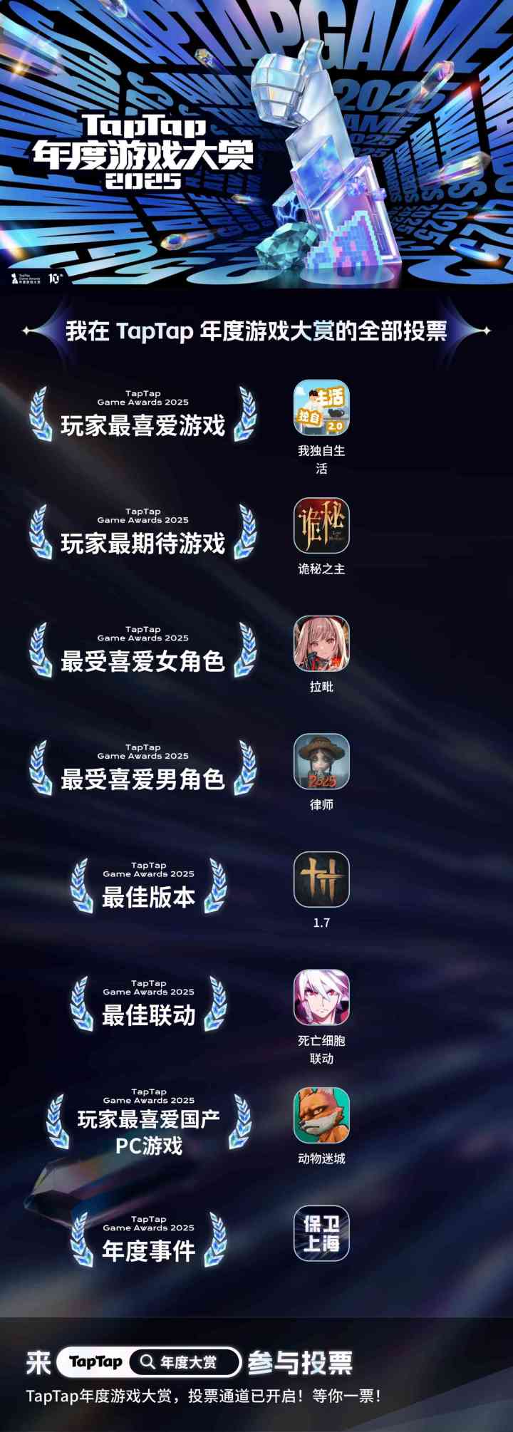#2025TapTap年度游戏大赏 #我的2025年度游戏报告 #2025年度游戏大赏 #我的2025游戏大赏 投了几个看好的,期待结果!