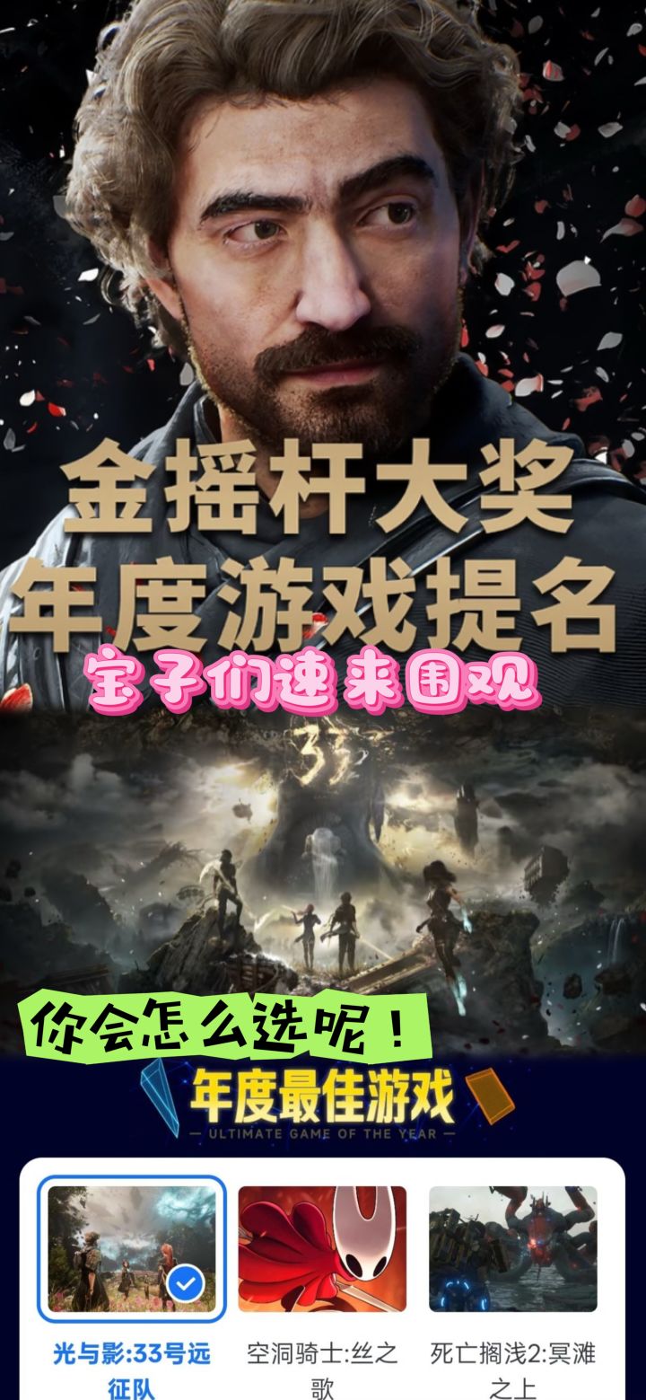 《光与影:33号远征队》《空洞骑士:丝之歌》《死亡搁浅2》《咚奇刚:蕉力全开》《PEAK》《羊蹄山之魂》《黑帝斯2》《天国:拯救2》《蓝途王子》《寂静岭F》《双影奇境》《夺宝奇兵:古老之圈》入围年度最佳游戏提名。 #金摇杆 #咪咕快游 #双影奇境