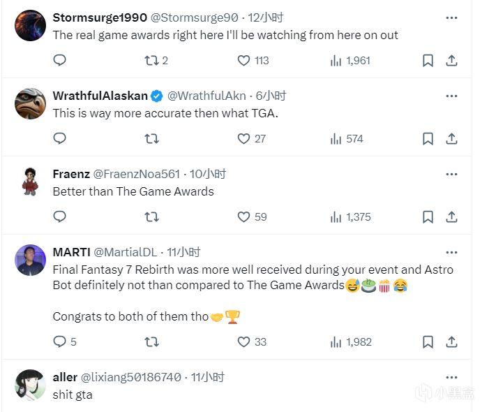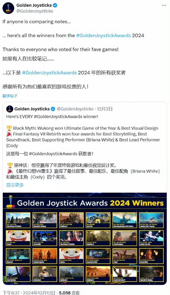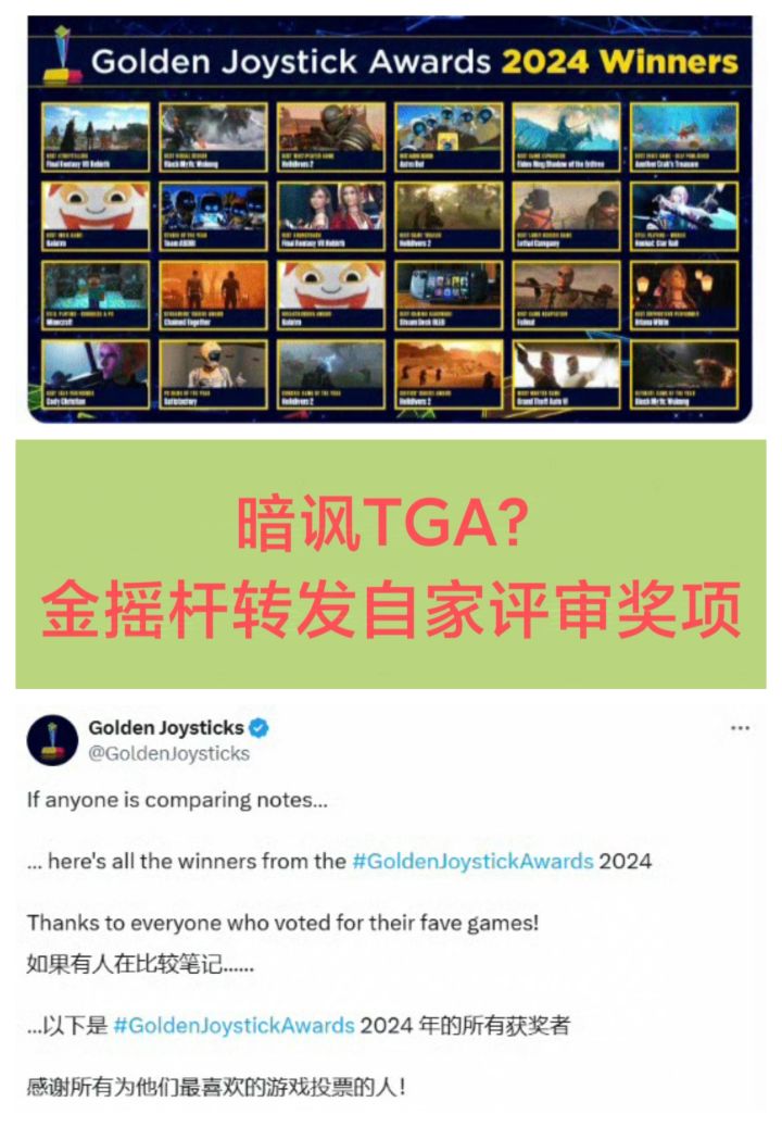 12/13号,金摇杆再次转发自家的奖项评审结果,暗讽TGA❗❗❗金摇杆文中暗暗表示,金摇杆的奖项都是玩家根据自己的喜好而投票出来的这里讽刺了TGA评审人那番“销量不重要,玩家体量不重要,玩家喜好不重要”的言论。在这个时机发这个,还有点贴脸开大的感觉捏其实,TGA也有完全由玩家喜好而投票出来的“玩家