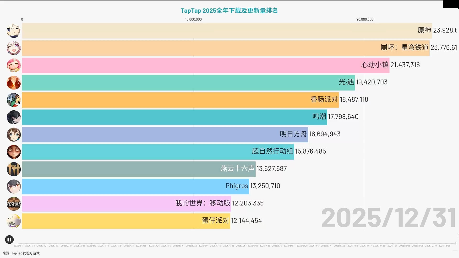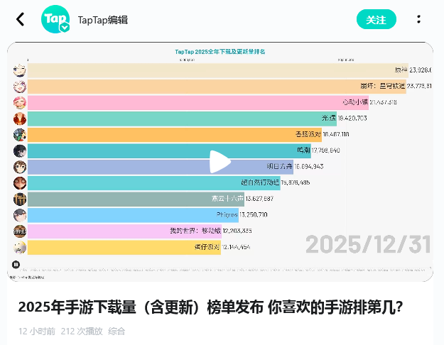 ❤TapTap年度榜单出炉!牢米双雄霸榜2025 大的又来了家人们!由上海米哈游网络科技股份有限公司制作发行的现象级开放世界冒险游戏《原神》,最近又成为了话题中的弄潮儿!原因系TapTap最新发布的年度数据,在2025年平台下载与更新量排名中,米哈游旗下产品表现抢眼。《原神》以约2392.86万的数据位列榜首,而同门的《崩坏:星穹铁道》以约2377.66万的成绩紧随其后,除了这两大巨头,模拟生