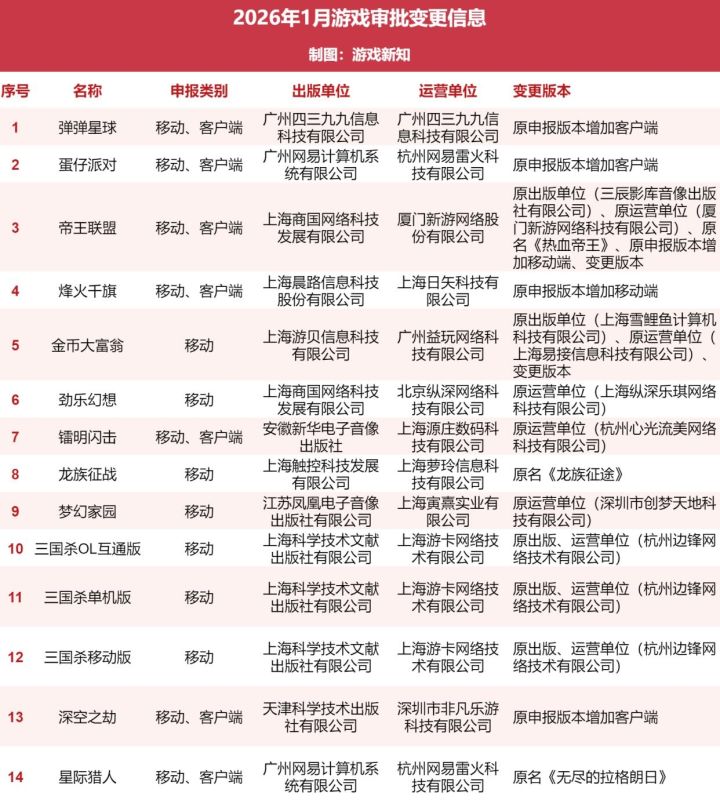 国家新闻出版署于今天1月26日公布了2026年1月的游戏版号审批结果:此次共有177款国产网络游戏获得版号,有5款进口网络游戏获批,有14款游戏涉及版号信息变更(如图)。而在获批的进口游戏中,育碧旗下的《彩虹六号:攻势》以客户端类别过审;金山世游的《愤怒的小鸟:经典归来》与《愤怒的小鸟:梦幻爆破》两款手游也获得进口版号,真的梦回童年了,愤怒的小鸟,期待上线;一同获批的进口游戏还包括《彩虹岛:爱丽