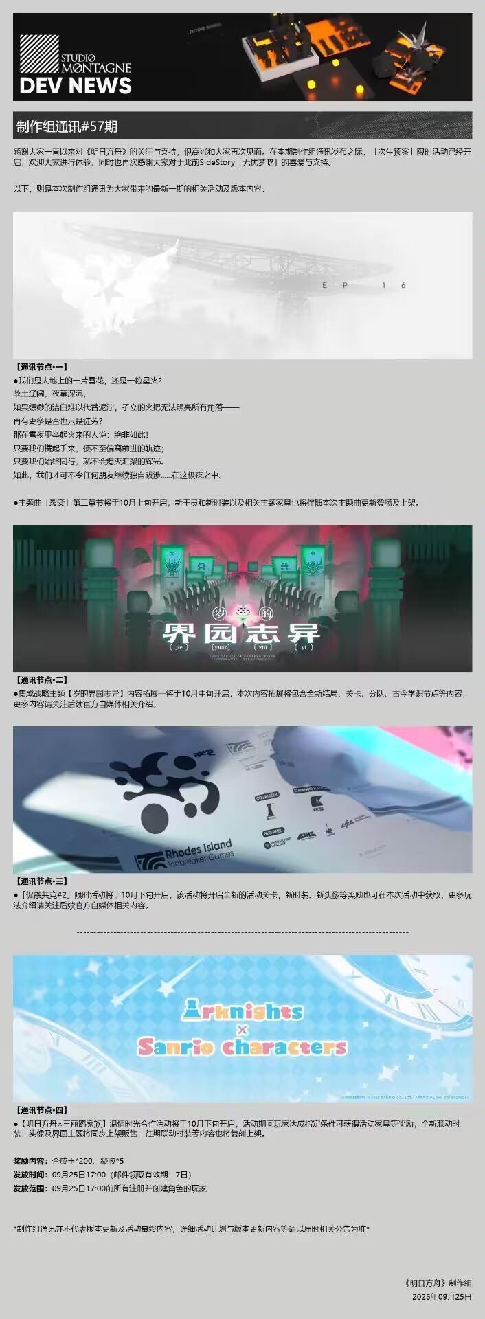 1.上旬开启新一章主线,预定在9号,在那之前,各位先推一下曲谱里的非主线关卡吧,长草期难得呀! 2.中旬开启集成战略界园主题的内容拓展,新结局的到来,干员风评又要变化了;前瞻时还提到,咱的特勤干员电弧将迎来第二个模组,期待她的新发挥 3.下旬开启「促融共竞#2」,根据前瞻,这次暂时没有足球赛玩了,有个新玩法补上,期待! 4.下旬开启与“三丽鸥家族”的新联动,纯装饰品的内容,上一期的也会复刻。上一期
