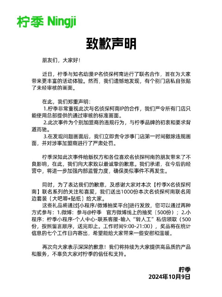 10/9号,茶饮品牌“柠季”与《名侦探柯南》的联名活动引发热议,“柠季”被迫道歉❗❗❗起因,有网友发帖投诉,柠季某门店挂出写有“谁才是你心目中的官配CP”的海报,海报上印有柯南和灰原哀,柯南和毛利兰两组人物网友表示,柯南及灰原哀在原作中并非恋人关系(CP),并且指责品牌方不尊重原作针对此事,柠季官
