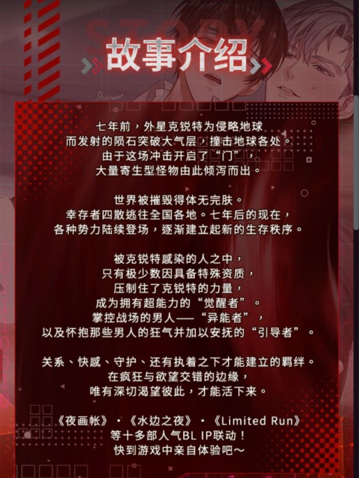 地狱和新世界同一工作室的游戏,好早之前就看见处于预约状态了结果到现在都还没上线……急急急真的很急啊,尤其看见那一列联动漫画名单,我的天还能说什么,半壁江山……快上线吧求求了(角色截图太多了就没全截下来,后面还有好几个,感兴趣大家可以去官网看看#发现好游戏 #零始之门 #bl #女性向 #女性向游戏