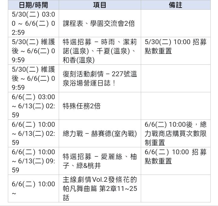 各位老師們好,這裡要告訴大家5月30日(二)的詳細更新內容。[5月30日(二)更新內容]-時間:5月30日(二)上午10點 ~ 下午3點-影響:維護期間內無法登入遊戲-補償:青輝石600個[5月30日(二)更新主要日程]* 以下為更新後遊戲內容的主要日程表,詳細內容請確認各項目的更新詳細說明。[5月30日(二)更新主要內容][詳細更新內容]1. 新增學生1) 時雨 (★3)2