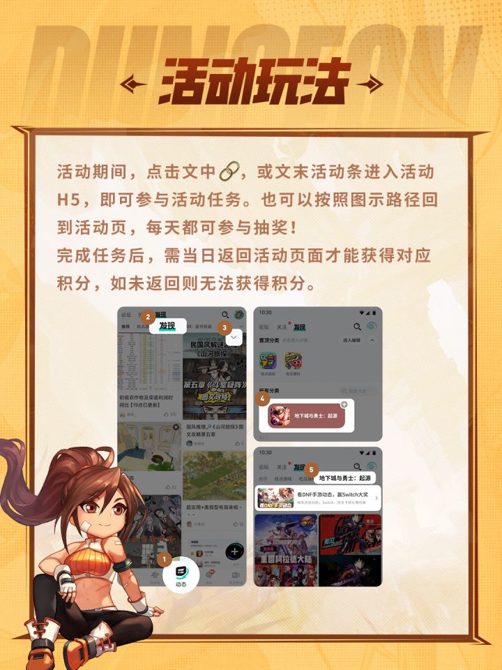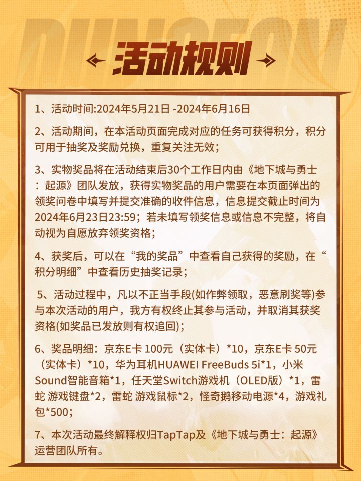 即日起至6月16日,参与TapTap《地下城与勇士:起源》限时福利活动,每天进入活动页面,完成浏览、发布等任务获得积分,所得积分可用于抽奖。