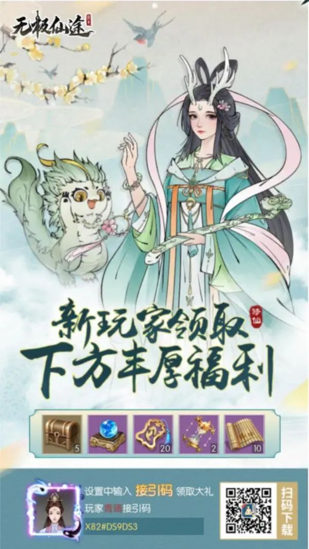 首先大乘期输入接引码X82#DS9DS3 输入后领取大礼包,奖励丰富,还有二十抽 ————————————兑换码:1W2关注谢礼分享攻略赢取豪礼仙途共度暖心盛典晒图抽奖赢豪礼猜猜我是谁呢晒晒你的娃YLB0401 无极仙途 无极微博专属福利 仙途快手粉丝专享 无极仙途抖音点赞 无极视频号关注礼 进说领加群福利 Fzlgame TYLB7839 TYLB0