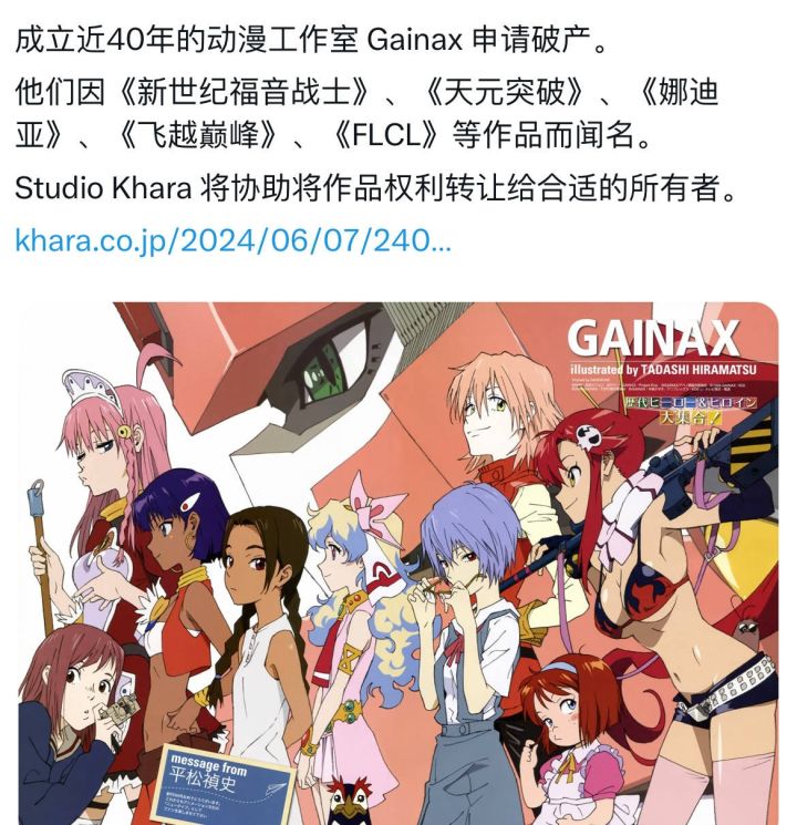 动画公司GAINAX 宣布破产!代表作:新世纪福音战士、天元突破、丹特丽安的书架、花丸幼稚园、吊带袜天使(新作换扳机社制作)等 #今天游戏圈发生了啥