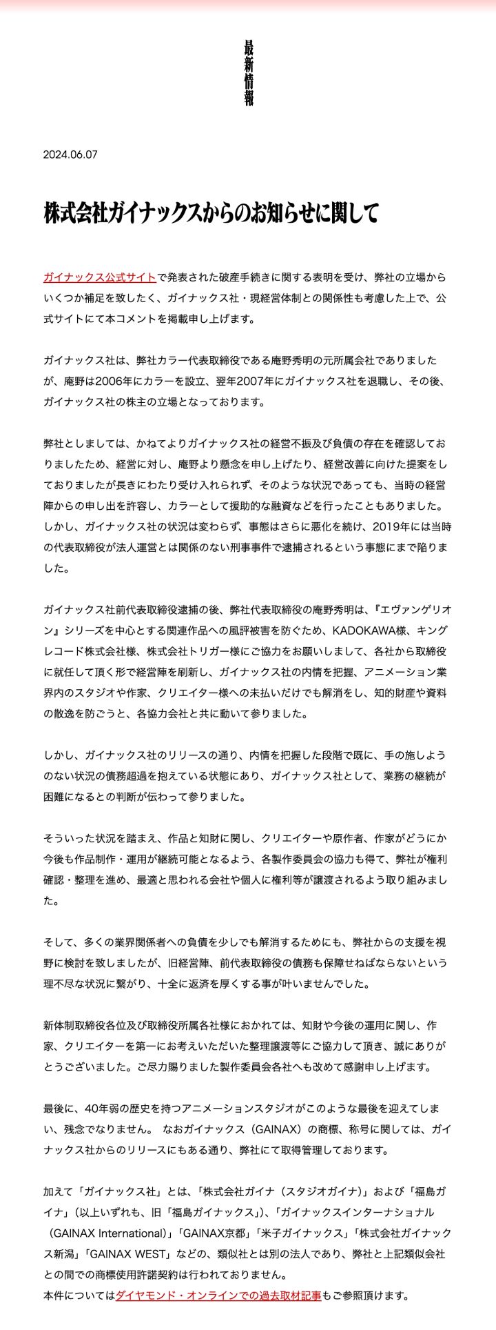 日本动画公司GAINAX已完成破产清算,法人资格注销,结束其四十二年的历史。该公司由庵野秀明、武田康广、山贺博之等动画界元老于1984年创立,代表作包含《新世纪福音战士》《天元突破》《吊带袜天使》《飞跃巅峰》《蓝宝石之谜》等。各作品的版权将通过正当手续归还给各权利人与创作者。自21世纪以来,公司渐渐衰弱,庵野秀明、今石洋之等核心人才陆续离开。2019年,时任社长卷智博因刑事案件被捕,导致公司经