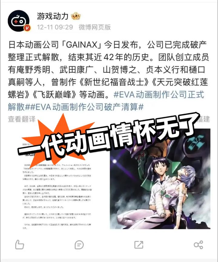 传奇落幕,《EVA》奠基者GAINAX正式解散,41年动画历程画上句号2025年12月11日,曾创作出《新世纪福音战士》(EVA)、《天元突破红莲螺岩》、《飞跃巅峰》等经典作品的日本传奇动画公司GAINAX正式发布公告,确认已完成破产整理程序,公司法人资格注销,宣告其近41年的历史就此终结。标志着时代的谢幕,一代二次元的青春随之落幕,创作者和动画爱好者们纷纷留言,表达对这家曾深刻影响日本动画黄